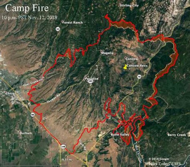 Named after Camp Creek Road, its place of origin, the fire started on Thursday, November 8, 2018, in Northern California’s Butte County. Ignited by a faulty electric transmission line, the fire originated above several communities and an east wind drove the fire downhill through developed areas.