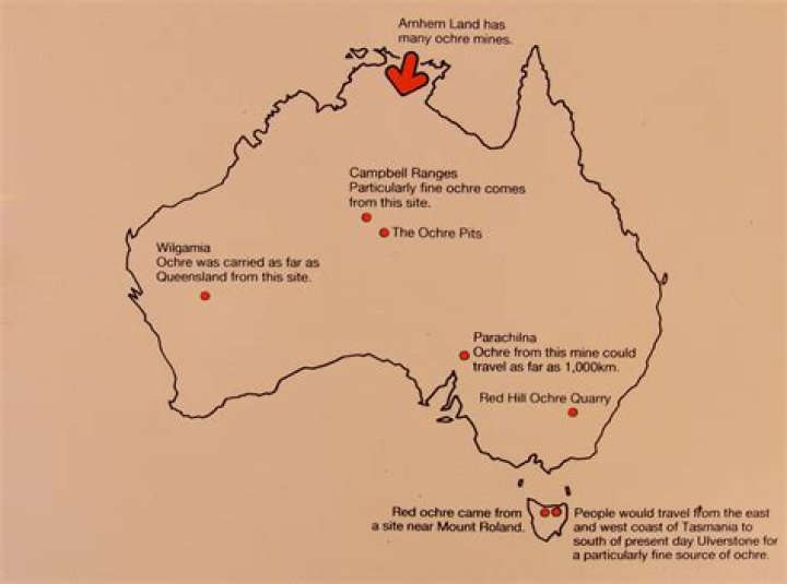 Known, fine-quality ochre deposits are spread as far apart as Arnhem Land in the Northern Territory, Wilgie Mia in the Murchison region of Western Australia, Red Hill in south-eastern Australia, the Western MacDonnell Ranges in Central Australia, and Lyndhurst and the Flinders Ranges in South Australia.