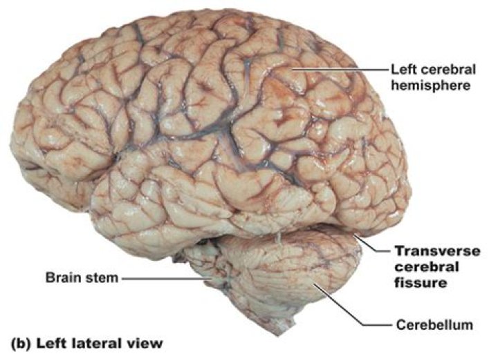 The cerebrum half is missing the longitudinal fissure – which divides the brain into nearly symmetrical left and right hemispheres. But the transverse fissure is clearly visible.