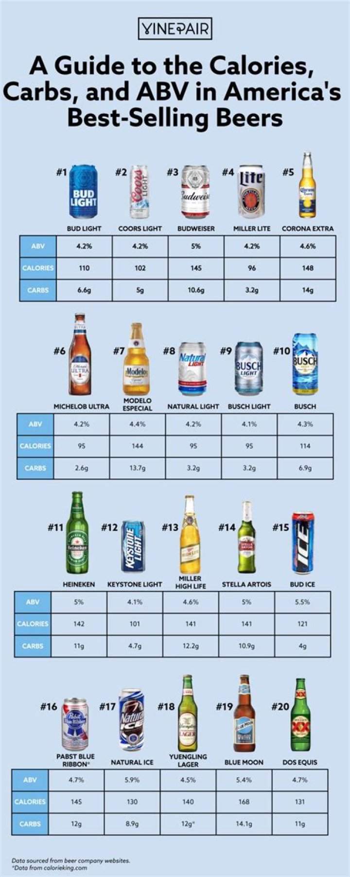 - Coors Light, Corona Light, Michelob Ultra, Miller Lite (100 calories)