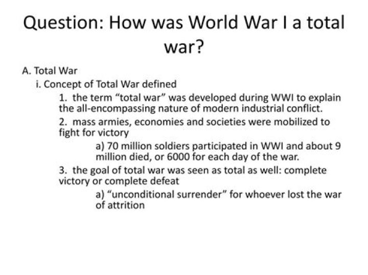 World War I is often referred to as the first “total war.” People at the time used this term to describe the size and devastation of the war. … They feel that the Civil War was a total war because it involved great loss and mobilization in the United States.Who used the term total war?