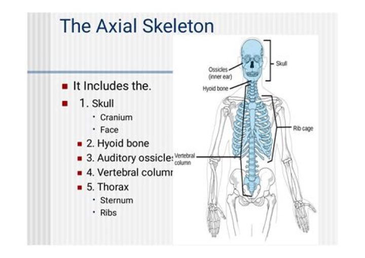 The axial skeleton consist of: the skull, hyoid bones, vertebral column, ribs, and sternum.