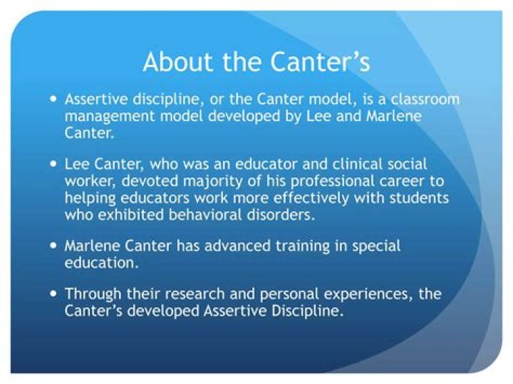 Assertive discipline theory is a teacher-centered classroom management approach founded by Lee and Marlene Canter. The approach believes in the rights of students and teachers to work in a safe, calm and professional environment.