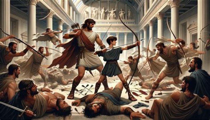 Telemachus then returns to the palace to keep an eye on the suitors and to await his father as the beggar. When Penelope challenges the suitors to string Odysseus’ bow and shoot an arrow through the handle-holes of twelve axe heads, Telemachus is the first to attempt the task.