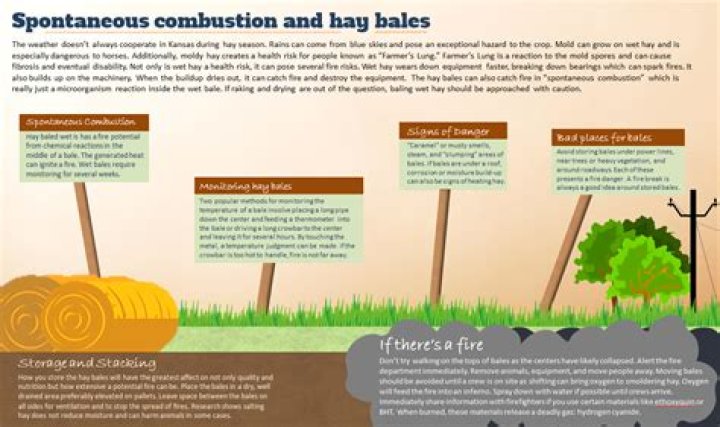 A chemical process that releases heat can cause hay bales to spontaneously combust, sometimes leading to farm fires. … Fires caused by spontaneous combustion typically start within six weeks of hay baling and are most likely to happen when moisture levels in the hay exceed 20 percent.