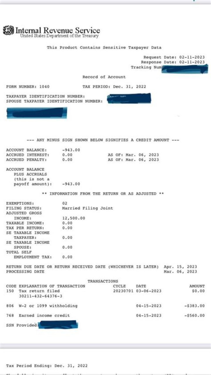 Tax Account Transcript – shows basic data such as return type, marital status, adjusted gross income, taxable income and all payment types. It also shows changes made after you filed your original return.