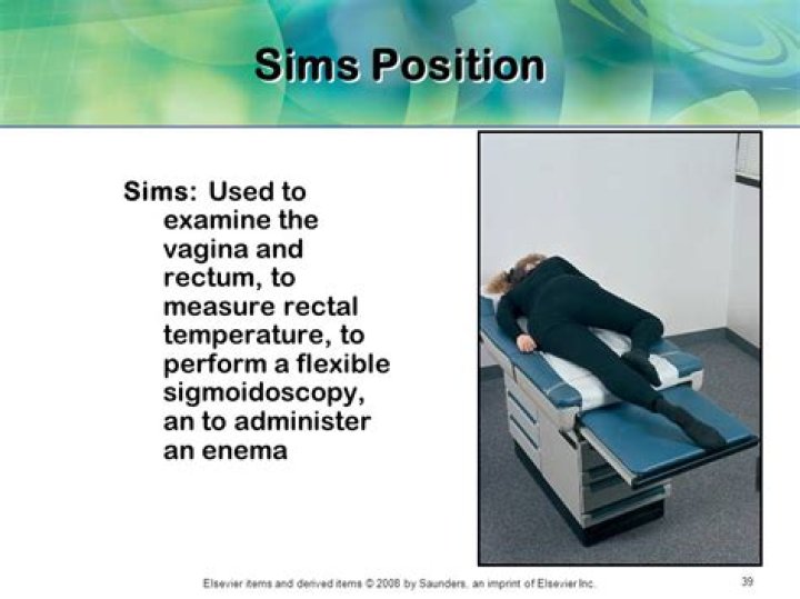 Sims’ position, named after the gynaecologist J. Marion Sims, is usually used for rectal examination, treatments, enemas, and examining women for vaginal wall prolapse. It is performed by having the person lie on their left side, left hip and lower extremity straight, and right hip and knee bent.