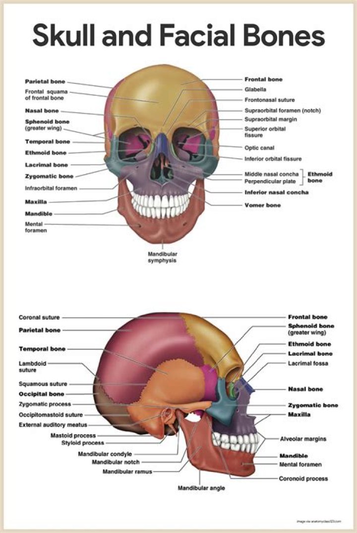 The skull (22 bones) is divisible into two parts: (1) the cranium, which lodges and protects the brain, consists of eight bones (Occipital, Two Parietals, Frontal, Two Temporals, Sphenoidal, Ethmoidal) and the skeleton of the face, of fourteen (Two Nasals, Two Maxillae, Two Lacrimals, Two Zygomatics, Two Palatines, Two …